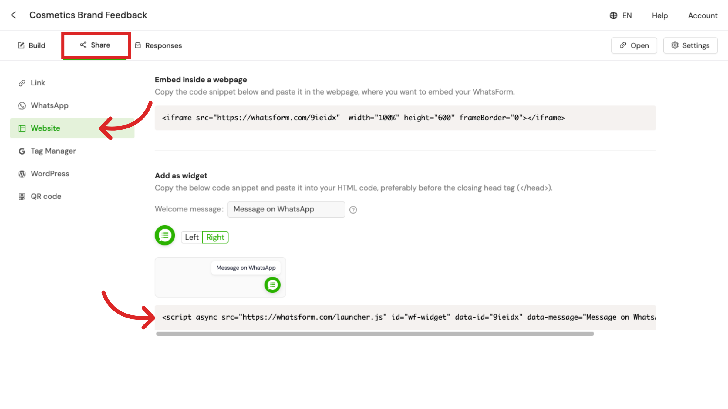 Go to your form’s Share tab, select Website, and copy the widget code under Add as widget.